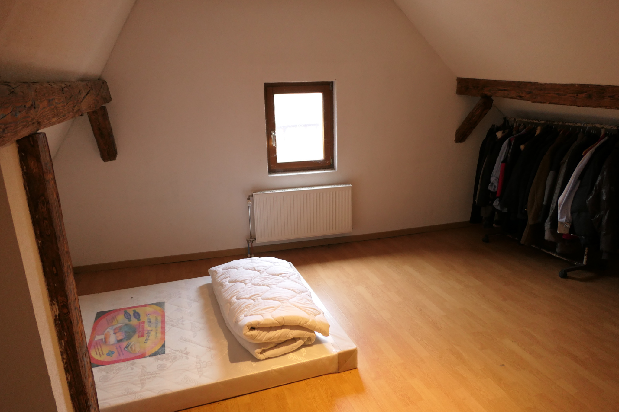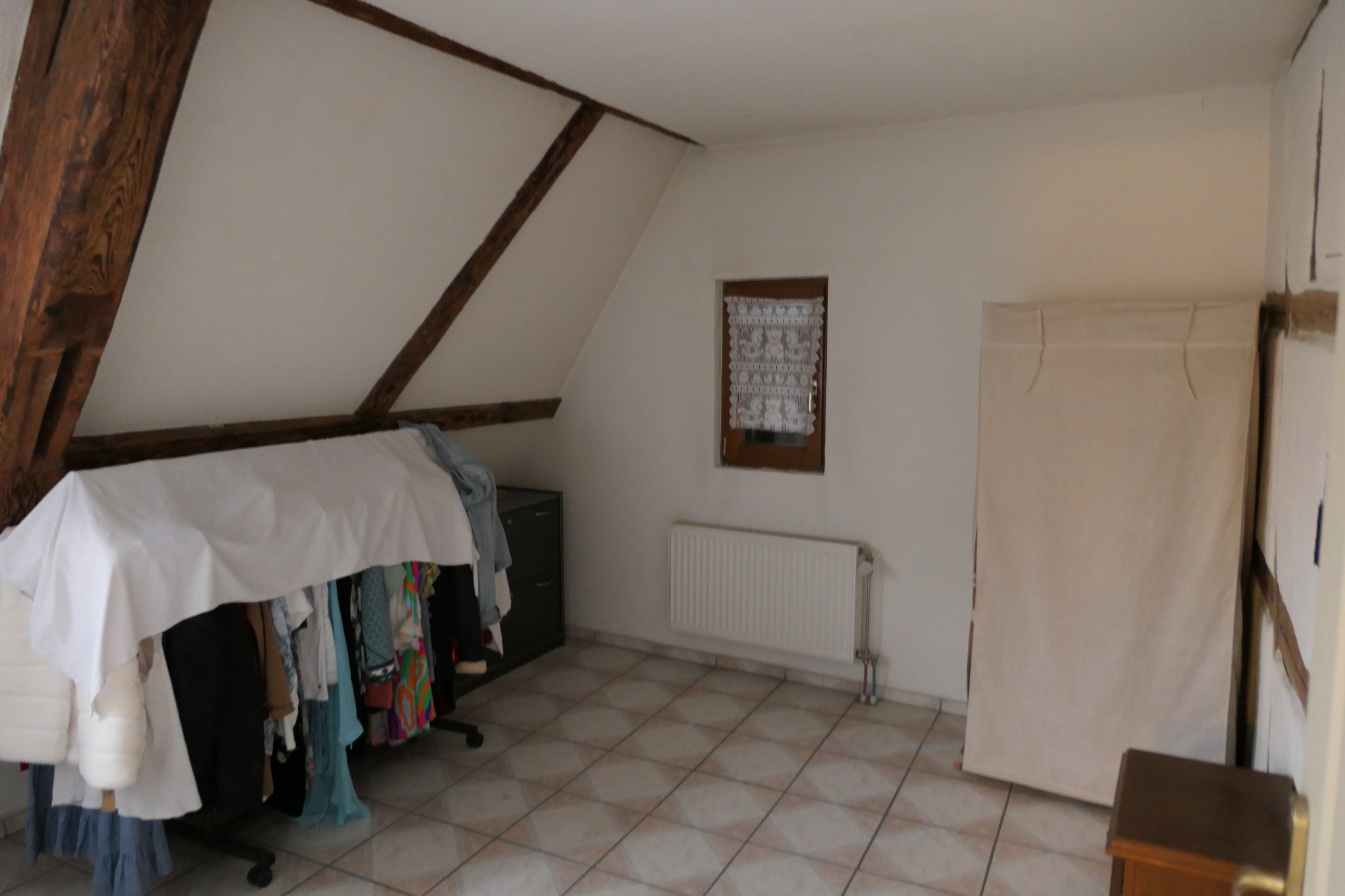 Le 1er étage propose une mezzanine ouverte sur la cuisine, mise en valeur par de poutres apparentes typiques de la tradition alsacienne, apportant un cachet authentique. Ce niveau comprend également une grande chambre, une salle de bain et un WC séparé.