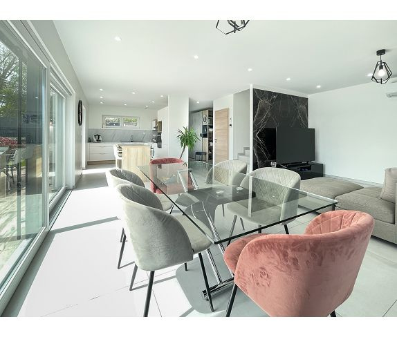 Cette pièce de vie dispose d'une cuisine moderne tout équipée, d'une salle à manger et d'un salon. Sa grande baie vitrée vous donnera accès au jardin et à sa terrasse afin de profiter des journées ensoleillées.