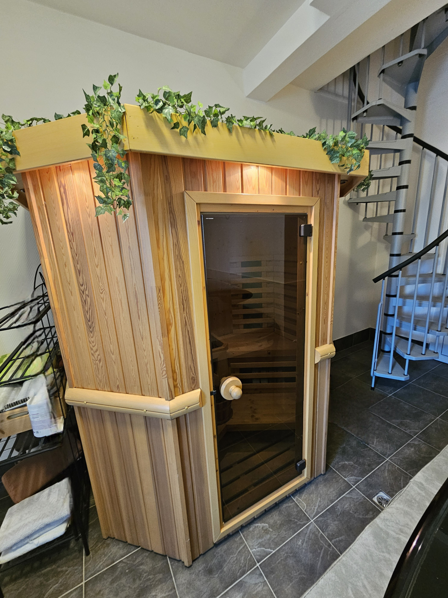 Le dernier niveau est une véritable invitation à la détente : accessible par un élégant escalier en colimaçon, découvrez un espace Wellness complet comprenant sauna, jacuzzi et douche à vapeur, avec un accès direct à une terrasse extérieure pour vos moments de relaxation.
