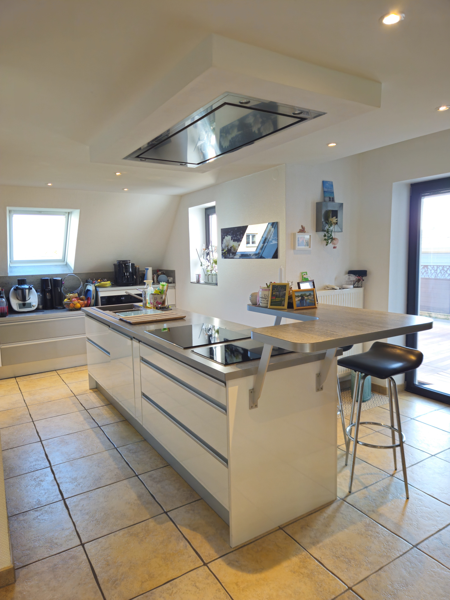 Espace de vie : Une entrée majestueuse dessert une cuisine de standing avec îlot central et coin repas, réchauffée par un poêle à pellets. L'accès direct aux terrasses invite à la convivialité intérieure-extérieure.